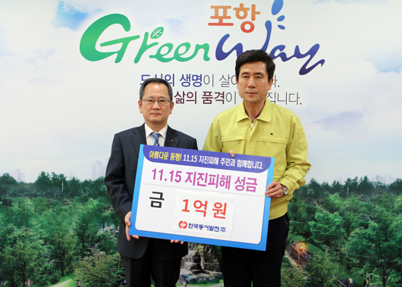 한국동서발전(사장직무대행 박희성)은 22일 오후 포항시청을 방문해 포항 지진 피해복구 성금 1억원을 전달했다.