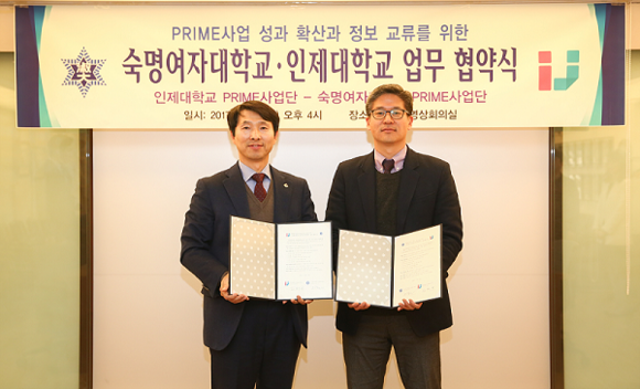 인제대학교(총장 차인준)와 숙명여자대학교(총장 강정애)는 27일 숙명여대에서 프라임사업 성과 확산과 정보 교류를 위한 업무협약을 체결했다.