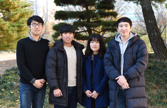 ▲한국전자통신학회 2017 가을철국제학술대회서 우수논문상을 수상한 (왼쪽부터) 부경대 박수호, 김흥민, 황도현, 김범규 씨. (사진제공=부경대)