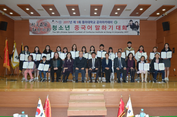 ▲'제9회 청소년 중국어 말하기 대회' 수상자들이 문철주(앞줄 가운데) 동아대 공자아카데미 원장과 무예(앞줄 오른쪽 다섯 번째) 주부산중국총영사관 부총영사, 박영남(앞줄 왼쪽 다섯 번째) 부산경남중국인교수연합회 회장 등과 기념촬영을 하고 있다. (사진제공=동아대)