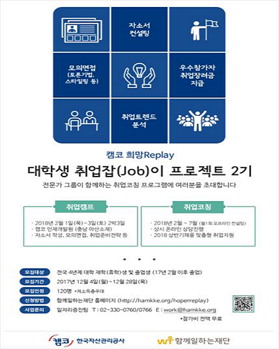 한국자산관리공사(캠코)는 취업을 준비하는 대학생들의 취업역량 강화 지원을 위한 '캠코 희망 Replay, 대학생 취업잡(Job)이 프로젝트' 2기 참가자를 오는 28일까지 모집한다고 4일 밝혔다.