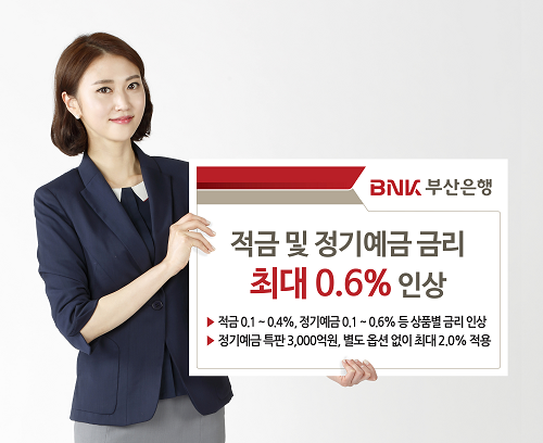 BNK부산은행(은행장 빈대인)은 한국은행의 기준금리 인상에 맞춰 오는 6일부터 적금과 정기예금 상품의 금리를 최대 0.60%까지 인상한다고 5일 밝혔다.