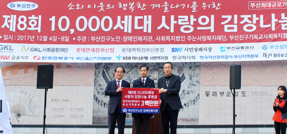 ▲문종철 캠코 부산본부장(왼쪽)이 4일 '1만세대 사랑의 김장나눔' 행사에서 기부금을 전달한 후 이현진 부산진구노인장애인복지관 운영위원장(가운데), 김익현 부산진구노인장애인복지관 관장과 함께 기념촬영을 하고 있다. (사진제공=캠코)