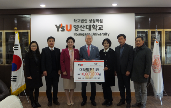 와이즈유 영산대학교(총장 부구욱) AHP(인문학최고위과정) 5기 원우들이 6일 모교 발전기금 1000만원을 기탁했다.