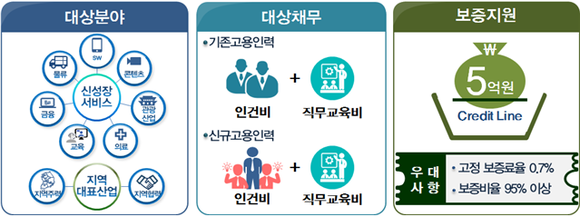지원대상은 고부가가치 신성장 서비스 분야(소프트웨어, 콘텐츠, 교육, 의료, 관광, 금융, 물류) 및 지역 특화형 일자리 창출 분야(지역주력·협력산업)를 영위하는 창업 3년 이내 기업으로, 최근 1년 이내 고용하였거나 향후 1년 이내에 신규 고용할 예정인 정규직 근로자에 대한 인건비와 직무교육비를 최대 5억원까지 지원한다.