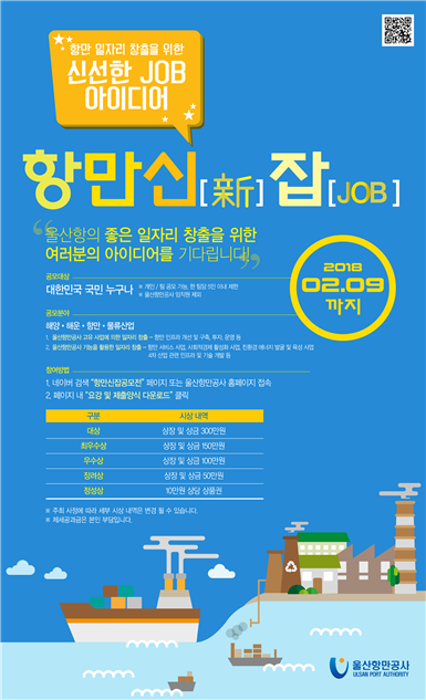UPA는 울산항을 활성화 할 수 있는 국민들의 아이디어를 반영해 민간분야의 좋은 일자리를 창출하고 울산항의 사회적 가치를 높이기 위해 전국민을 대상으로 '항만 신(新)잡(Job) 아이디어 공모전'을 내년 2월 9일까지 진행한다고 8일 밝혔다.