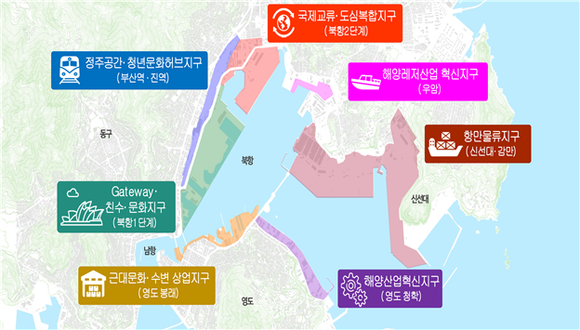 해수부는 이날 부산항 북항 일원을 7대 권역으로 나누어 각각의 특화된 기능을 살리도록 하는 기본구상안 방안을 소개하고 '사람과 바다가 어우러지는 글로벌 신(新)해양산업 중심지 육성'이라는 비전을 제시한다.