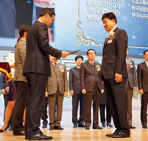 ▲이우승 캠코 부사장(사진 오른쪽)이 14일 광주 김대중 컨벤션센터에서 열린 '2017년 제6회 대한민국 교육기부대상' 시상식에서 '교육부장관상'을 수상하고 있다. (사진제공=캠코)
