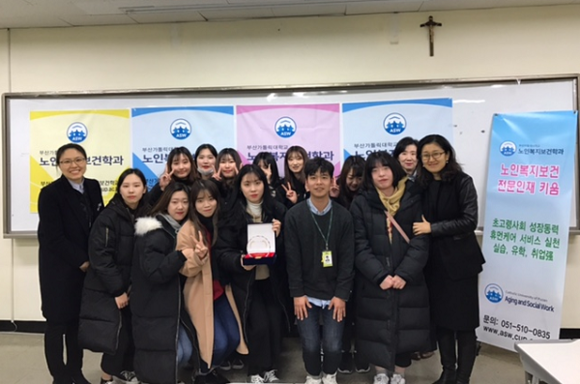 부산가톨릭대학교(총장 김영규) 재학생으로 구성된 행복나눔봉사단은 15일 금정구종합사회복지관으로부터 지역사회 내 소외된 노인들의 행복증진에 기여한 노력을 인정받아 공로패를 받았다.