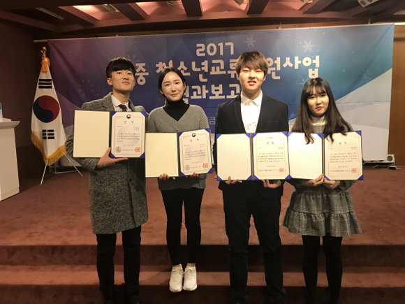 ▲'2017 한·중 청소년 교류 지원사업 결과보고회'에서 입상한 (왼쪽부터) 경성대 손옥새, 조민수, 소우명(위도계 대리수상), 조아란 씨. (사진제공=경성대)