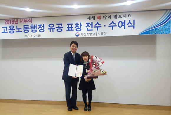 신라대 장희정 도시재생일자리지원센터장(국제관광학부 교수·사진 오른쪽)이 2일 부산지방고용노동청에서 열린 '고용노동행정 유공 표창 전수·수여식'에서 일자리창출지원 부문 '대통령 표창'을 수상했다.
