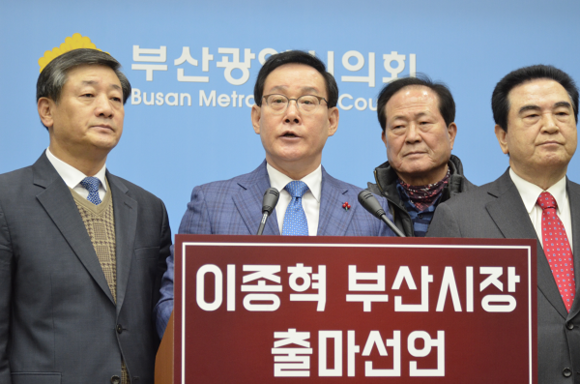 ▲이종혁 전 자유한국당 최고위원(가운데)이 4일 오전 부산시의회에서 기자회견을 열고 부산시장 선거 출마를 선언하고 있다. (사진=CNB 최원석 기자)