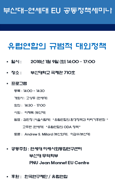 부산대학교는 PNU EU센터가 연세대 미래사회통합연구센터와 함께 오는 9일 오후 2시부터 교내 국제관 710호에서 '유럽연합의 규범적 대외정책'을 주제로 'EU 공동정책 세미나'를 개최한다고 5일 밝혔다.