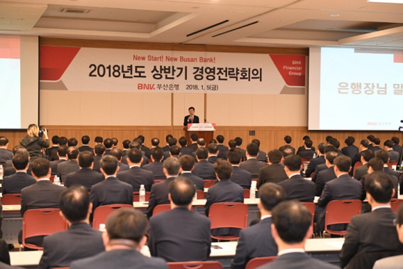 BNK부산은행은 5일 오후 해운대 벡스코 컨벤션홀에서 빈대인 은행장을 비롯한 전 경영진과 부실점장, BRM(리테일영업팀장) 등 320여 명이 참석한 가운데 '2018년 상반기 경영전략회의'를 열었다.