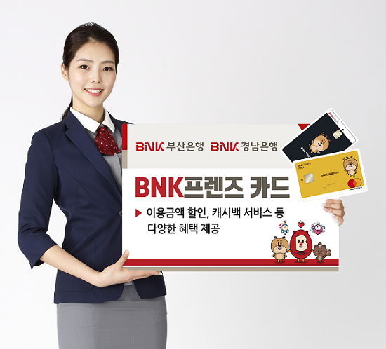 'BNK프렌즈 신용/체크카드'는 미스터 비(Mr. B), 엔젤케이(Angel K), 바우와우(BowWow) 등 BNK금융의 'BNK프렌즈' 캐릭터를 카드 디자인에 적용했다.