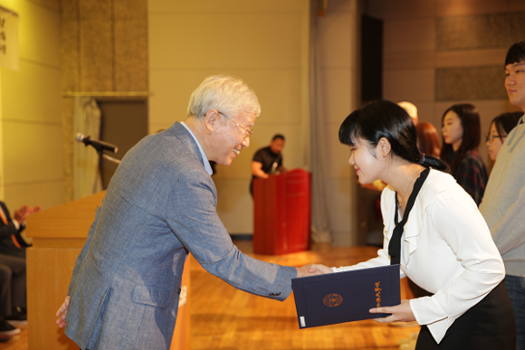 ▲지난 2학기 인제스타장학금 전달식에서 인제대 차인준 총장이 학생들에게 장학증서를 전달하고 있다. (사진제공=인제대)