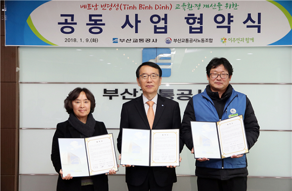 부산교통공사와 부산교통공사노동조합은 9일 노사 공동으로 '(사)이주민과 함께'와 협약을 맺고 베트남 빈딩성 청소년 교육환경 개선사업을 위한 PC구매 지원금 1천만 원을 전달했다고 밝혔다.