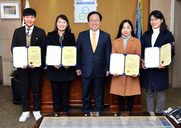 김석준 부산시교육감이 9일 오전 교육감실에서 심장마비로 쓰러진 학생에게 심폐소생술 등 응급처치를 해 생명을 구한 부산 성심보건고등학교 김미숙, 김수연, 김현정 교사와 천태웅 학생(1학년)에게 표창장을 수여했다.