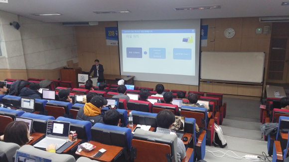 ▲9일 홍익대에서 한국 내쇼날인스트루먼트 권오훈 차장이 '자율주행자동차 개발을 위한 프로그래밍 언어(Labview)'에 대해 교육하고 있는 모습. (사진제공=교통안전공단)