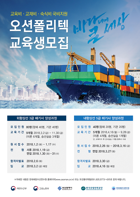 한국해양수산연수원은 오션폴리텍 외항상선 3급·내항상선 5급 해기사 양성과정의 2018년도 교육생을 모집한다고 12일 밝혔다.