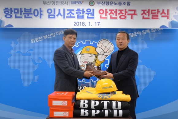 부산항만공사(BPA)는 창립 14주년을 맞아 일반부두 내 임시직 항만근로자를 대상으로 안전화, 안전모 등 안전장구 958개를 지급키로 하고, 17일 오전 부산항운노동조합에서 전달식을 가졌다.