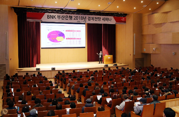 부산은행은 19일 오후 본점 대강당에서 고객과 시민 400여명을 초청해 '미리 보는 미래, 2018년 경제전망과 투자전략'을 테마로 '부산은행 2018년 경제전망 세미나'를 개최했다.