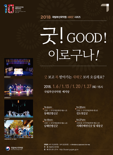 새해맞이 굿시리즈 <굿!GOOD!이로구나!>는 전통문화예술의 원형이 담긴 굿판의 상생과 치유의 예술적 가치를 재발견하고자 기획된 공연이다. 국악원에서는 지난해부터 다채롭고 품격 높은 굿 공연으로 일반 애호가 관객들을 위해 새해 신명난 굿판을 마련하고 있다.