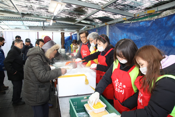 좋은데이나눔재단은 25일 부산 부산진역 일대에서 부산밥퍼나눔공동체와 함께 '2018 좋은데이나눔재단과 함께하는 신년 떡국 나눔행사'를 진행했다.
