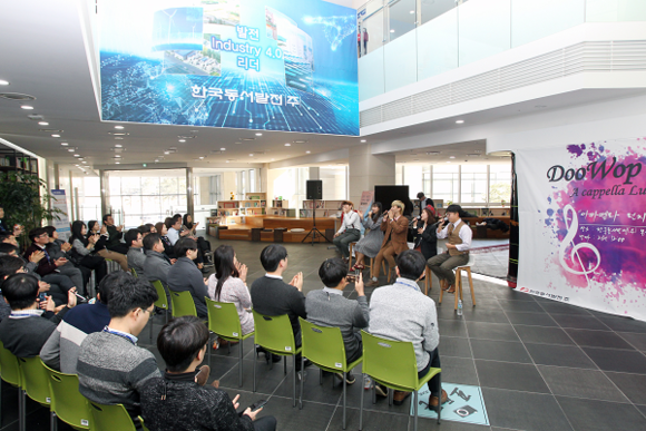 한국동서발전은 최근 울산 본사 로비에서 동서발전 임직원들이 참석한 가운데 창업아카데미 예비 창업자들로 구성된 공연 그룹 두왑사운즈의 '아카펠라 런치페스타(Iunch festa)'가 열렸다고 29일 밝혔다.