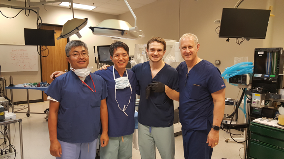 ▲고신대복음병원 이강대 교수(왼쪽 2번째)와 의료진들이 인투이티브 서지칼 실험 후 기념촬영을 하고 있다. (사진제공=고신대복음병원)