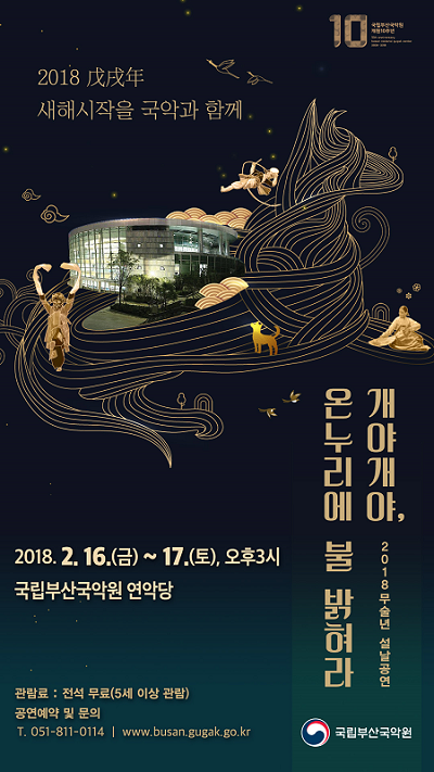 국립부산국악원은 오는 16, 17일 오후 3시 연악당에서 2018 무술년 새해 시작을 국악과 함께하는 설날공연 <개야 개야, 온누리에 불 밝혀라>를 개최한다.