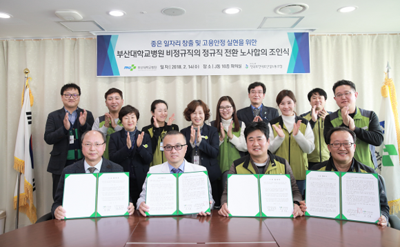부산대병원은 정규직 전환 정책에 적극 부응하여 좋은 일자리 창출을 위한 노사협의기구를 구성, 작년 10월부터 현재까지 9차례 협의와 실무교섭을 통해 비정규직 근로자 1017명의 정규직 전환에 2월 14일 노·사가 최종 합의했다.