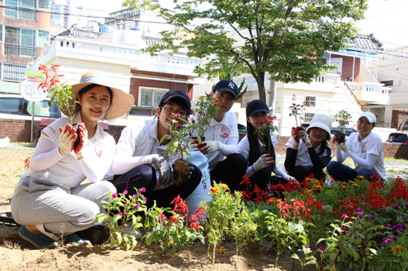 ▲부산은행 대학생 홍보대사들이 부산 전포동 일대에서 쓰레기 무단투기 zero 캠페인을 펼치며 쓰레기 상습무단투기지역에 꽃밭을 조성하는 모습. (사진제공=부산은행)
