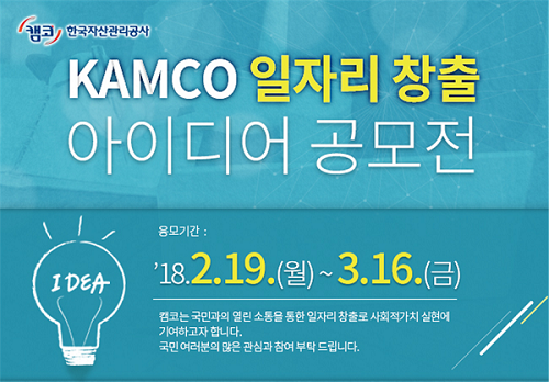 한국자산관리공사(캠코)는 다음달 16일까지 '캠코 일자리 창출 아이디어 공모전'을 진행한다고 19일 밝혔다.