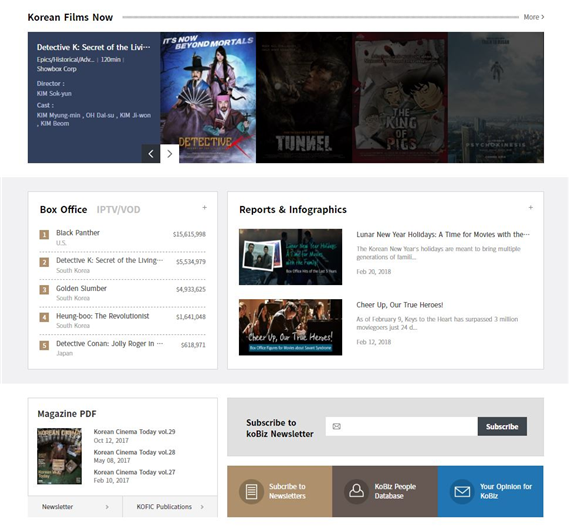 오석근 영진위원장은 “이번 온라인비즈니스센터(KoBiz) 영문 홈페이지 개편을 바탕으로, 해외 영화 산업 관계자들에게 좀 더 다양하고 정확한 한국영화정보가 제공될 수 있도록 콘텐츠 관리를 강화하고 위원회가 보유하고 있는 다양한 정보를 활용해 실질적인 서비스를 확대 제공할 예정”이라고 말했다.