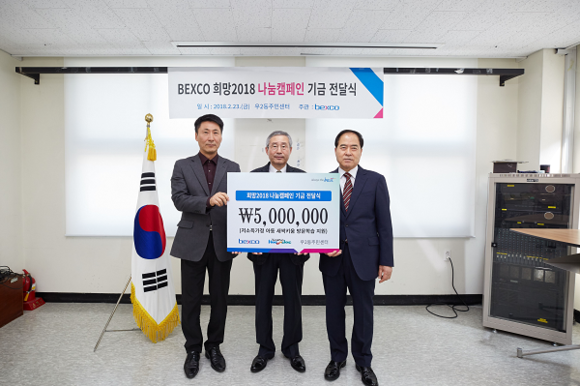 이어 23일에는 해운대구 우2동 주민센터에서 저소득가정 아동 및 학생 대상 '새싹키움 방문학습 지원금' 및 '청소년 장학금'을 각 500만원씩 총 1천만원 전달했다. `05년부터 올해로 14년째를 맞이한 '희망 나눔 캠페인 기금' 전달은 벡스코가 지역주민들에게 받은 사랑을 돌려드리고 지역사회와 함께 성장해 나가고자 매년 2월에 시행하고 있다.