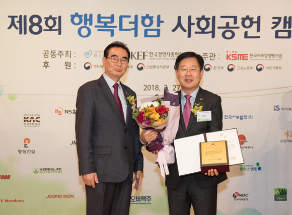 한국남동발전이 27일 서울 롯데호텔에서 열린 '2018 행복더함 사회공헌 대상' 시상식에서 기획재정부 장관상을 수상했다.