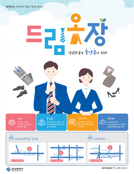 '드림옷장'은 부산시에 거주하는 만18세~34세 이하 청년으로 면접을 앞두고 있는 취업 준비생이면 누구나 이용 가능하며, 기본 정장(자켓, 치마, 바지, 셔츠, 블라우스) 뿐만 아니라 필요시 구두, 넥타이, 벨트 등 면접에 필요한 모든 소품을 한 곳에서 무료로 대여해 줄 계획이다.