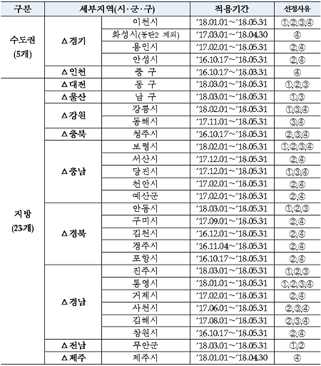 전월 17차 미분양관리지역(24개) 대비 △대전 동구, 울산 남구, 경북 안동시, 경남 진주시, 전남 무안군 5곳이 미분양 우려 등의 사유로 추가 지정됐다.