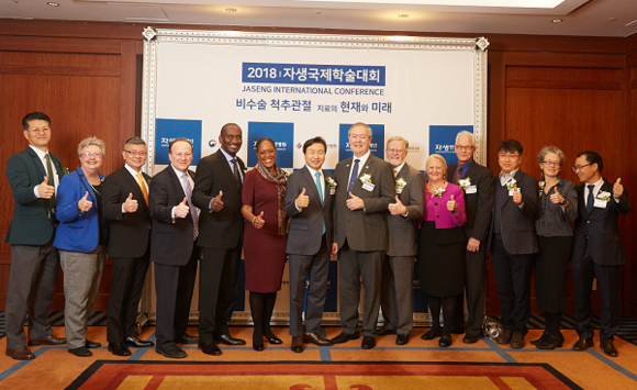 ▲4일 열린 '2018 자생국제학술대회'에 참석한 척추신경추나의학회 신준식(가운데) 설립자와 국내외 수기치료 전문가들이 기념사진을 찍고 있다. (사진제공=자생한방병원)