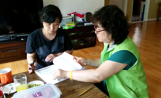 ▲'부산 에너지홈닥터'가 한 가정집을 방문해 전기에너지 사용실태 및 절약방법에 대해 안내하고 있다. (사진제공=부산시)