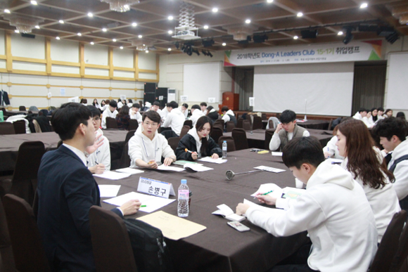 ▲최근 경주 코오롱호텔에서 열린 'Leaders Club 15-1기 취업캠프'에 참가한 학생들이 기업에 재직 중인 선배와 상담하고 있다. (사진제공=동아대)