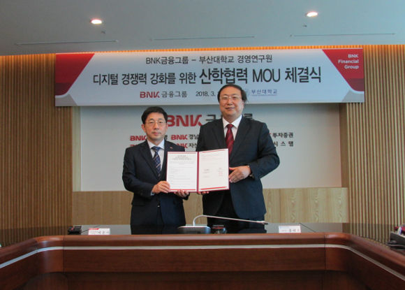 BNK금융은 13일 오전 디지털 비즈니스 연구개발을 담당하는 부산대학교 경영연구원과, 같은 날 오후에는 울산과학기술원(UNIST) 빅데이터·디지털마케팅 연구센터와 업무협약(MOU)을 체결했다.