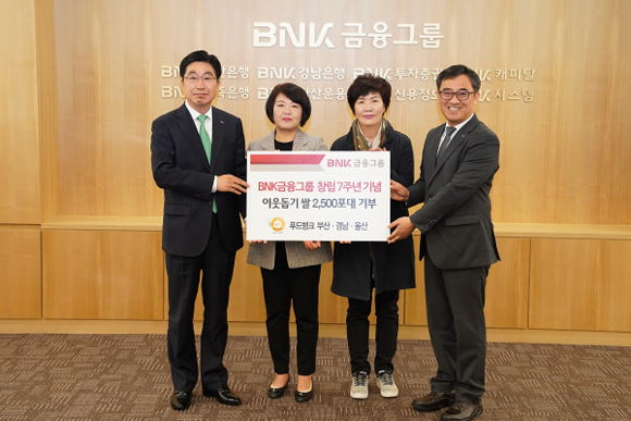 BNK금융그룹은 14일 오전 본점에서 지역사회와의 나눔 실천을 위해 부울경 지역 광역푸드뱅크와 '이웃돕기 쌀 나눔 전달식'을 가졌다.