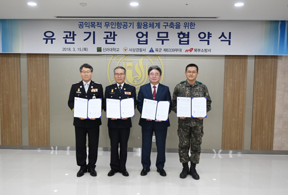 신라대와 부산사상경찰서, 육군 제6339부대, 부산북부소방서 등 4개 기관은 15일 신라대 종합강의동 2층 대회의실에서 각 기관 대표 및 주요 인사들이 참석한 가운데 공익목적 무인항공기(드론) 활용관련 유관기관 업무협약식을 가졌다.