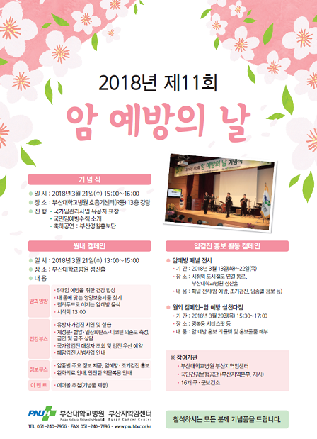 29일에는 야회행사로 오후 5시 30분부터 부평시장, 국제시장 등 광복동 일대에서 부산시, 건보공단 부산본부, 16개 구·군보건소 암관리사업 담당자들과 함께 암 예방 홍보물을 배부하는 거리 합동 캠페인이 열린다.