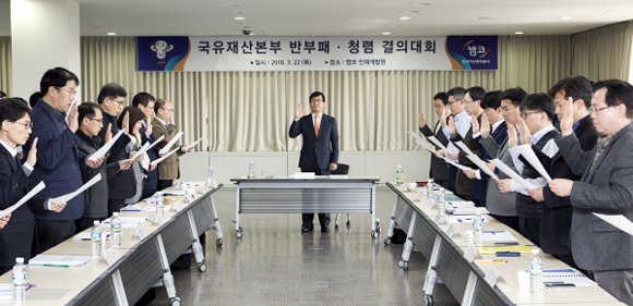 한국자산관리공사(캠코)는 22일 오후 캠코 인재개발원 다목적홀에서 국유재산본부 송유성 이사를 비롯한 임직원 60여명이 참석한 가운데 '국유재산 반부패·청렴 결의대회'를 개최했다.