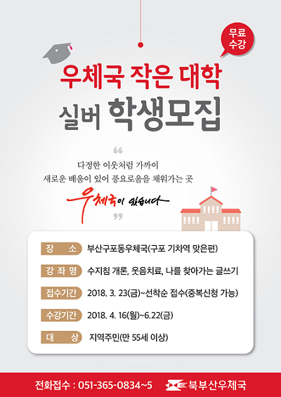 부산지방우정청은 우체국 여유공간을 활용해 지역주민과 함께 부산구포동우체국에서 '우체국 작은대학'을 열고 수강생을 모집한다고 28일 밝혔다.