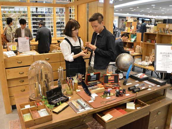 29일 롯데백화점 부산본점 4층 남성복 매장에 볼펜으로 유명한 '모나미 스토어'가 오픈해 고객들에게 큰 관심을 얻고 있다. 이 매장에서는 원하는 컬러로 볼펜과 만년필 잉크를 만드는 DIY 체험을 비롯해 만년필, 노트, 볼펜 등 다양한 제품의 필기구와 사무용품을 선보이고 있다. (사진=롯데백화점)