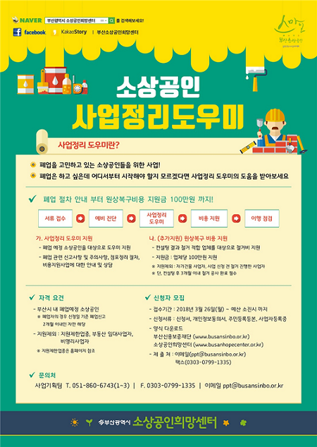 사업정리 도우미 지원사업과 소상공인 행복복지 지원사업의 지원 신청 및 자세한 사항은 부산시소상공인희망센터로 문의하면 된다.